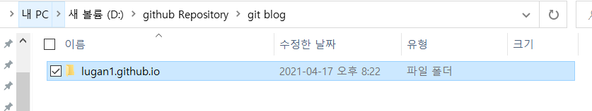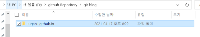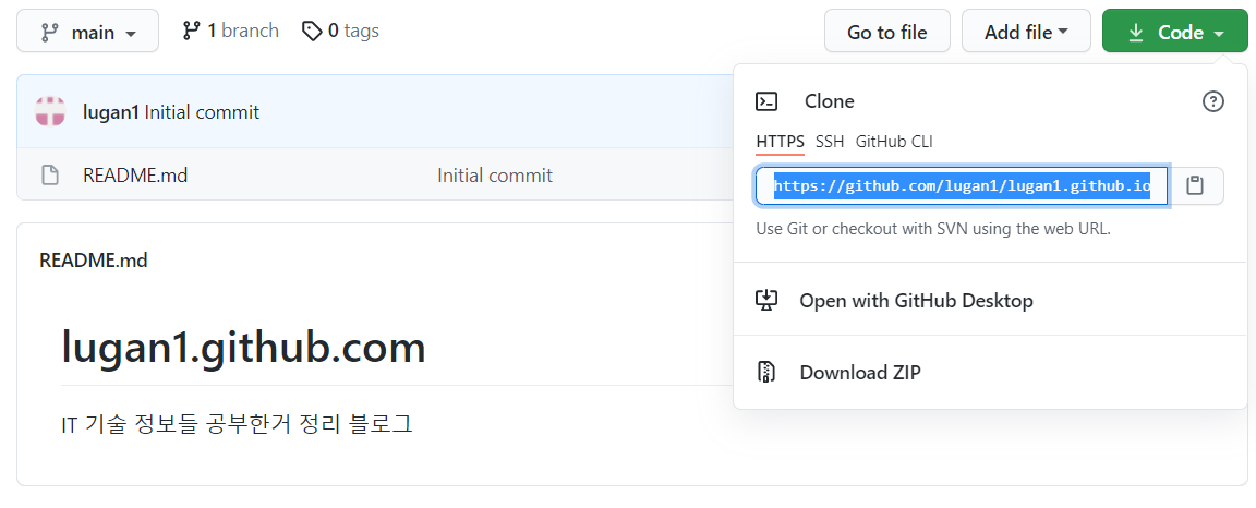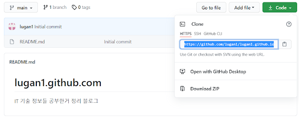 만들때 Repository 이름을 "[본인 ID].github.io" 형식으로 만듬, Readme Install 에 체크함