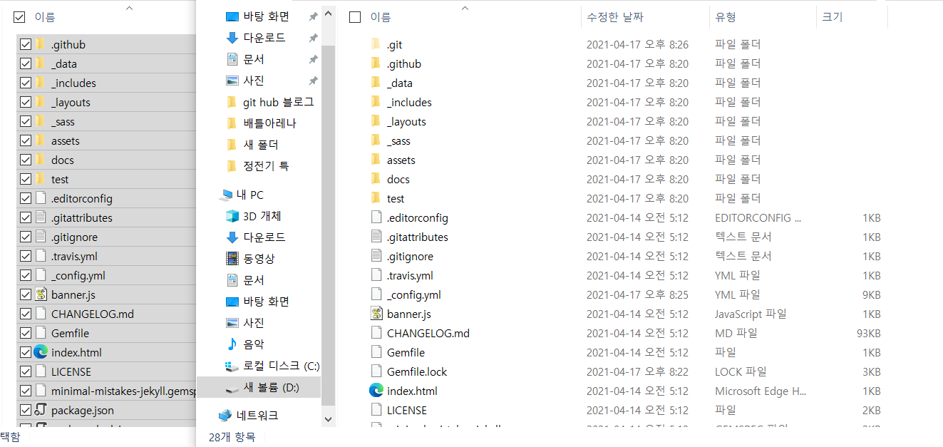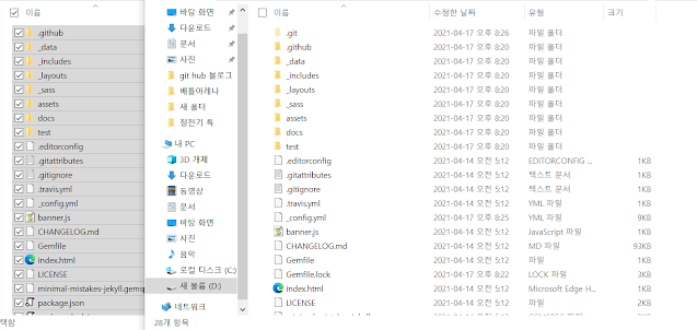 Step 2에서 다운로드한 테마를 압축풀고, 아까 clone 다운로드한 repository 폴더에 내용물 복사함