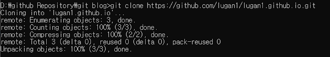cmd 창에서 git clone 명령어를 사용해서 repository 내용을 폴더에 다운로드함 (복제)