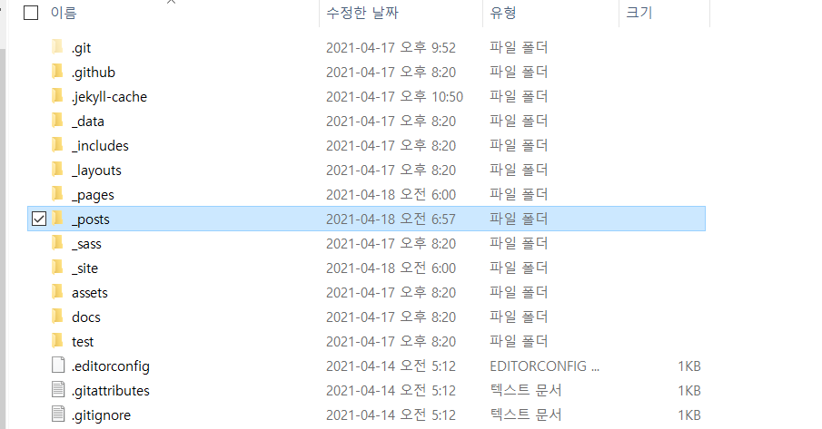 파일 이름은 YEAR_MONTH_DAY_title.md 형식으로 _posts 폴더에다가 저장함